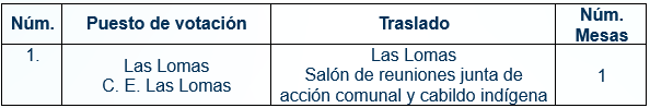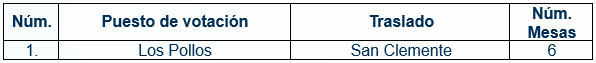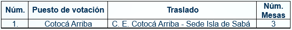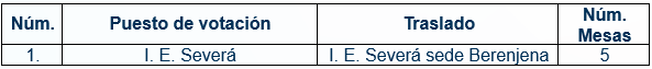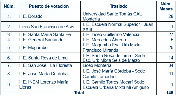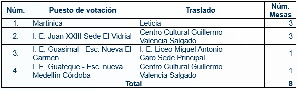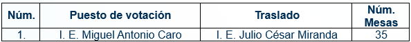 A continuación, se relacionan los puestos de votación trasladados, así como el número de mesas correspondientes a cada uno: