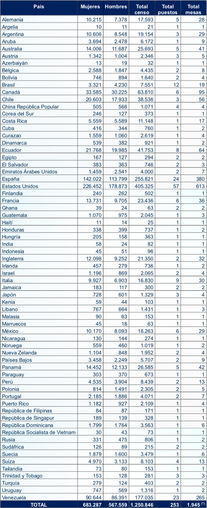 A continuación, se detalla el censo electoral en el exterior: