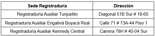 Adicionalmente, las registradurías auxiliares de Tunjuelito, Engativá Boyacá Real y Kennedy Central prestarán todos sus servicios a los ciudadanos de 8:00 a. m. a 12:00 m.