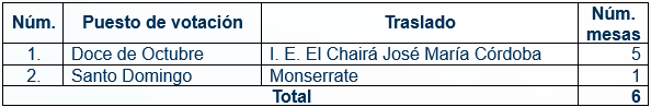 A continuación, se detallan los dos puestos de votación que fueron trasladados, así como el número de mesas de cada uno: