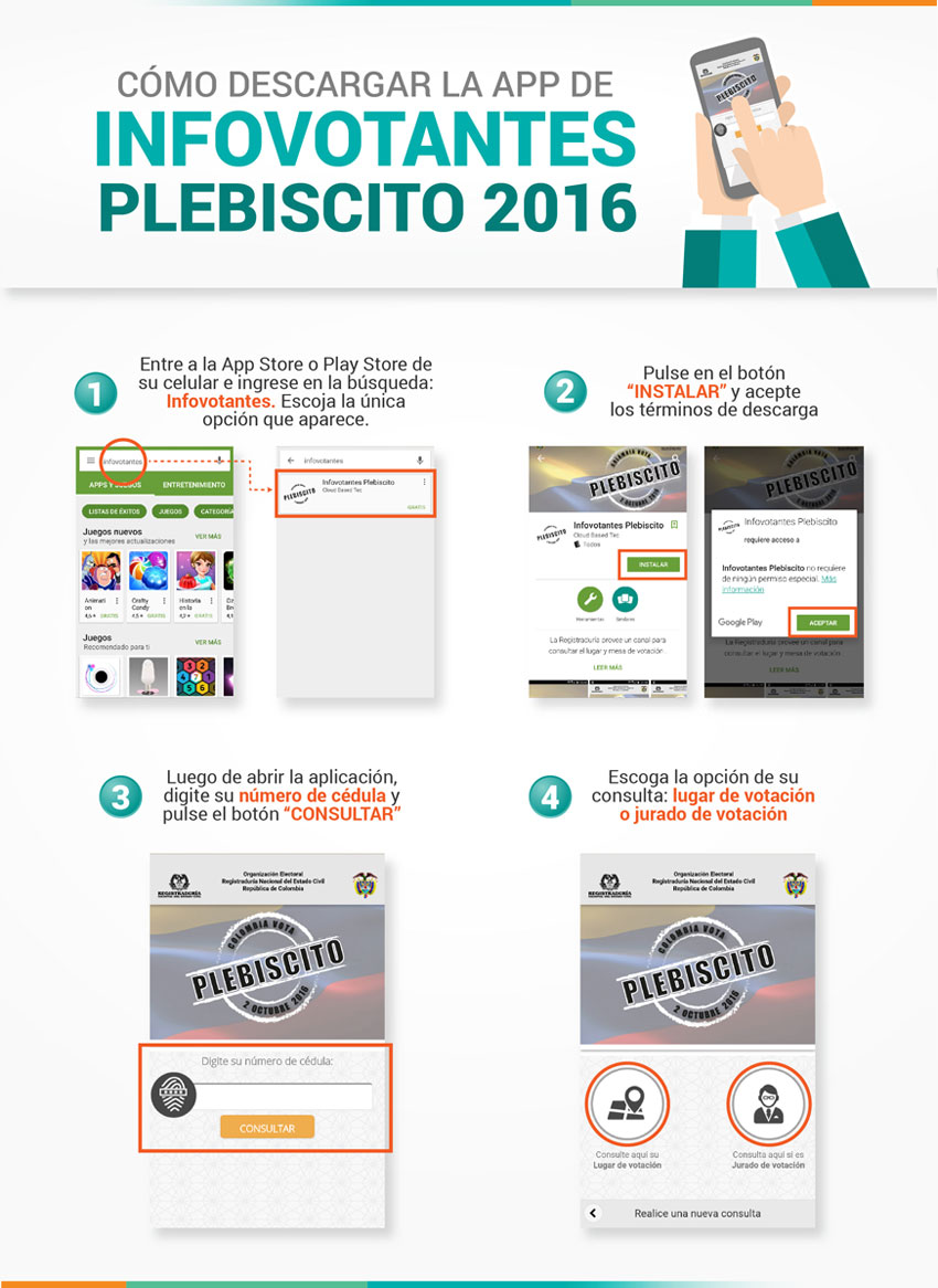La Registraduría Nacional del Estado Civil lanza aplicativo para dispositivos móviles, donde los colombianos pueden consultar su lugar de votación y verificar si fueron escogidos para prestar el servicio como jurados de votación el 2 de octubre durante el Plebiscito 2016.